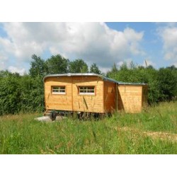 Wo haben Sie Ihre letzte Konferenz / Tagung / Seminar / Fortbildung erlebt? Vermutlich in einem netten Hotel in.. ja wie hieß die Stadt noch gleich und worum ging es eigentlich? Wenn zukünftige Veranstaltungen Ihren Mitarbeitern oder Kollegen in positiver Erinnerung bleiben sollen, dann sind Sie bei uns richtig! Bei uns haben Sie die Möglichkeit in einem 46 m² großen, hochwertig ausgestatteten Konferenzwagen zu tagen. Ein Konferenzwagen dieser Art dürfte in Deutschland wohl einzigartig sein. Gefertigt aus Holz; die moderne Interpretation eines Zirkuswagens. Mit ca. 46 m² ist dieser Wagen riesig, groß genug für Gruppen bis 24 Personen (theoretisch auch bis 30 Personen möglich). Die Teilnehmer sitzen links und rechts etwas erhöht an Tischen, der Seminarleiter ist in der Mitte des Wagens, durch die Bauart bedingt quasi in einer rechteckigen „Manege“. Die Aufmerksamkeit ist ihm gewiss. Von der Decke können zwei Flachbildschirme geklappt werden, der Seminarleiter kann diese mittels HDMI Kabel mit seinem Laptop verbinden, ein Beamer ist nicht notwendig. Ein Teil des Wagens (ca. 6 m²) kann mittels Klapptüren vom Raum getrennt werden. Dieser Raum kann vielfältig genutzt werden, z.B. als Stauraum, um ein Büfett dort aufzubauen, als kleine Bühne, um einen Überraschungsgast zu verstecken oder er bietet auch Platz für einen weiteren Tisch und ca. 6 Personen. Die Teilnehmer haben einen tollen Ausblick in die Natur. Gewärmt wird der isolierte Wagen durch einen Holzofen; Holz stellen wir Ihnen selbstverständlich kostenlos zur Verfügung. Ausreichend Steckdosen sind vorhanden. Toiletten befinden sich in ca. 100 m Entfernung.