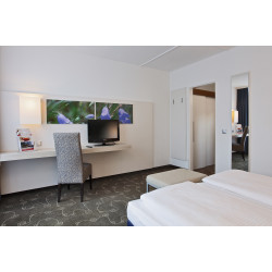 Das mit 3 Sternen+ ausgezeichnete, barrierefreie Concorde Hotel Siegen liegt zentral in der Stadt, nahe des St.-Marien-Krankenhauses und in fußläufiger Entfernung zu vielen Sehenswürdigkeiten. Den Bahnhof erreichen Sie in einer guten Viertelstunde zu Fuß. 60 kostenfreie Parkplätze sind am Hotel vorhanden. Zur Ausstattung gehören 94 Nichtraucherzimmer, ein Restaurant, eine Café-Bar, ein Schwimmbad mit Sauna sowie 7 Tagungsräume. In diesem Hotel können Sie gerne Ihren Hund mitbringen. Die insgesamt 94 Gästezimmer unterteilen sich in Einzel-, Doppel- und Twinzimmer der Kategorien „Komfort“ und „Superior“ sowie in Suiten/ Appartements. Alle Zimmer sind mit einem Flachbildfernseher und einem Schreibtisch ausgestattet, WLAN ist inklusive und Sky Sports-TV kostenlos. Die etwas größeren Superiorzimmer verfügen über komfortablere Badezimmer mit Badewanne, Bidet und Doppelwaschtisch. In der Suite und dem Apartment profitieren Sie von einem eigenen Wohnbereich. Zustellbetten sind im Business Doppelzimmer und im Apartment möglich. Der Tag beginnt im Concorde Hotel Siegen mit einem umfangreichen Frühstück vom Buffet. Wählen Sie aus Käse, Aufschnitt und Fisch oder aus süßen Marmeladen, Müsli-Variationen und anderen Leckereien, was Ihnen persönlich zusagt. Im Restaurant werden internationale und regionale Gerichte von der Karte serviert, in der Café-Bar bekommen Sie Kaffee, Tee, einen Drink oder ein frisch gezapftes Bier. Erholung bietet das Panoramaschwimmbad in der obersten Etage. Schwimmen Sie ein paar Bahnen und genießen Sie den Ausblick über die Dächer von Siegen. Auch eine Sauna und ein kleiner Fitnessbereich fördern das Wohlbefinden. Die 7 Tagungsräume liegen hauptsächlich in der sechsten und siebten Etage des Concorde Hotels Siegen und sind ein angenehmer Rahmen für Tagungen, Seminare oder andere Veranstaltungen. Die modern ausgestatteten Räume bieten Platz für bis zu 120 Personen. Auf Wunsch steht Ihnen das Hotelteam bei der Planung und Durchführung gern zur Seite.