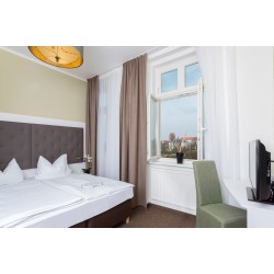 Unser 3*** Superior Hotel der gehobenen Mittelklasse liegt am Rande der historischen Altstadt mit Blick auf das prachtvolle Güstrower Schloss und seinen Garten. Das Haus verfügt über eine großzügige Lobby mit Bar und einer Rezeption, die im übrigen 24 Std. besetzt ist. Im Restaurant Wallenstein können Sie in einer gediegenen Atmosphäre das umfangreiche Frühstücksbuffet und das Abendessen genießen - im Sommer auch auf der Terrasse. In unserem privat geführten Hotel können Sie zwischen drei Zimmerkategorien "Standard"-,"Economy"- oder "Spar"-Zimmer wählen. Einige Zimmer verfügen über Schlossblick. Viele Zimmer liegen zur Gartenseite. Das neue Studio mit Küche hat Schlossblick. Unser Angebot ist ausgezeichnet mit dem Siegel der "Service-Qualität Deutschland". Wir bieten unseren Gästen einen Saunabereich, kostenlose Parkplätze auch für Busse, einen öffentlichen Internet-Terminal, kostenloses W-Lan, 2 Fahrstühle, einen Fahrradkeller, einen Fahrradverleih, Waschsalon mit Trockner u.v.m. an..