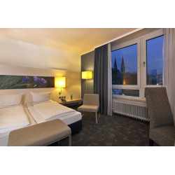 Das mit 3 Sternen+ ausgezeichnete, barrierefreie Concorde Hotel Siegen liegt zentral in der Stadt, nahe des St.-Marien-Krankenhauses und in fußläufiger Entfernung zu vielen Sehenswürdigkeiten. Den Bahnhof erreichen Sie in einer guten Viertelstunde zu Fuß. 60 kostenfreie Parkplätze sind am Hotel vorhanden. Zur Ausstattung gehören 94 Nichtraucherzimmer, ein Restaurant, eine Café-Bar, ein Schwimmbad mit Sauna sowie 7 Tagungsräume. In diesem Hotel können Sie gerne Ihren Hund mitbringen. Die insgesamt 94 Gästezimmer unterteilen sich in Einzel-, Doppel- und Twinzimmer der Kategorien „Komfort“ und „Superior“ sowie in Suiten/ Appartements. Alle Zimmer sind mit einem Flachbildfernseher und einem Schreibtisch ausgestattet, WLAN ist inklusive und Sky Sports-TV kostenlos. Die etwas größeren Superiorzimmer verfügen über komfortablere Badezimmer mit Badewanne, Bidet und Doppelwaschtisch. In der Suite und dem Apartment profitieren Sie von einem eigenen Wohnbereich. Zustellbetten sind im Business Doppelzimmer und im Apartment möglich. Der Tag beginnt im Concorde Hotel Siegen mit einem umfangreichen Frühstück vom Buffet. Wählen Sie aus Käse, Aufschnitt und Fisch oder aus süßen Marmeladen, Müsli-Variationen und anderen Leckereien, was Ihnen persönlich zusagt. Im Restaurant werden internationale und regionale Gerichte von der Karte serviert, in der Café-Bar bekommen Sie Kaffee, Tee, einen Drink oder ein frisch gezapftes Bier. Erholung bietet das Panoramaschwimmbad in der obersten Etage. Schwimmen Sie ein paar Bahnen und genießen Sie den Ausblick über die Dächer von Siegen. Auch eine Sauna und ein kleiner Fitnessbereich fördern das Wohlbefinden. Die 7 Tagungsräume liegen hauptsächlich in der sechsten und siebten Etage des Concorde Hotels Siegen und sind ein angenehmer Rahmen für Tagungen, Seminare oder andere Veranstaltungen. Die modern ausgestatteten Räume bieten Platz für bis zu 120 Personen. Auf Wunsch steht Ihnen das Hotelteam bei der Planung und Durchführung gern zur Seite.