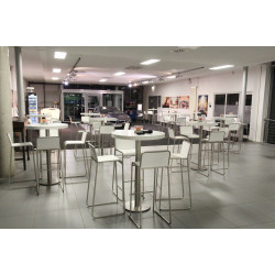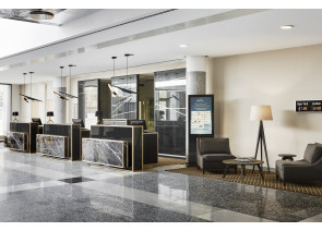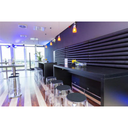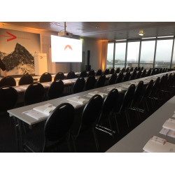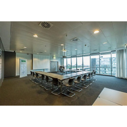 Die Ebene 4 und 5 verfügen über einen großen vollklimatisierten Seminarraum, der sich mit einer Trennwand in 2 äume (2/3 - 1/3) teilen lässt. Beamer und Leinwand sind fest verbaut und können angemietet werden. Eigene Hygienibereiche in jeder Etage ermöglichen kurze Wege. Auf einer Gesamtfläche von 140m² finden bis zu 140 Personen platz für Tagungen oder Austellungen. Durch die mögliche Raumtrennung sind auch Workshops oder Vorträge in kleineren Gruppen umsetzbar.